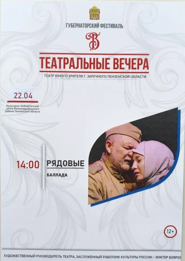 22 апреля в 14.00 в районном Доме культуры Малосердобинского района состоится показ баллады «Рядовые» театр юного зрителя г. Заречный Пензенской области. Мероприятие пройдет в рамках губернаторского фестиваля «Творческие встречи», «Театральные вечера». Вход по пригласительным билетам.